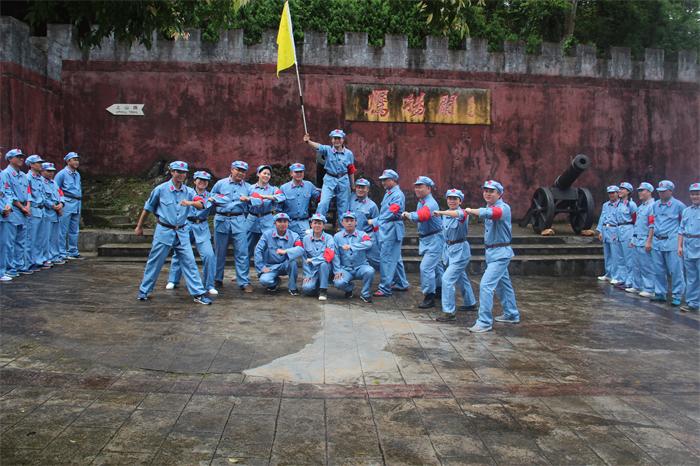經(jīng)過一路爬涉,我們終于到達了紅七軍廣場。廣場足有兩個球場寬大,廣場的背景是一幅紅七軍的巨型浮雕,“鷹揚關(guān)”三個大字蒼勁有力赫然其中,兩門古炮架設(shè)兩旁蔚為壯觀。據(jù)教官介紹,這里就是湘、桂、粵三省交界處,號稱“一腳踏三省”的地方。遙想當年,紅七軍就是在這里集結(jié)從廣西進入廣東連山。