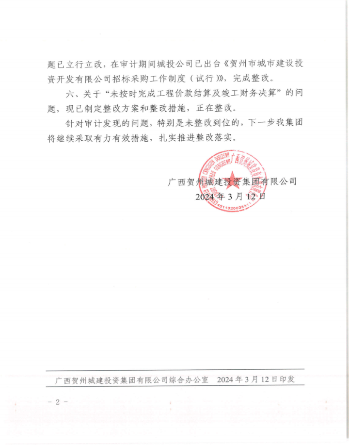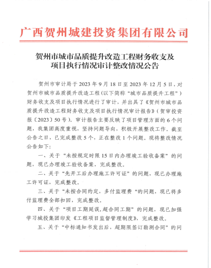 上一篇:廣西賀州城建投資集團有限公司2022年度財務收支情況審計整改情況公告
